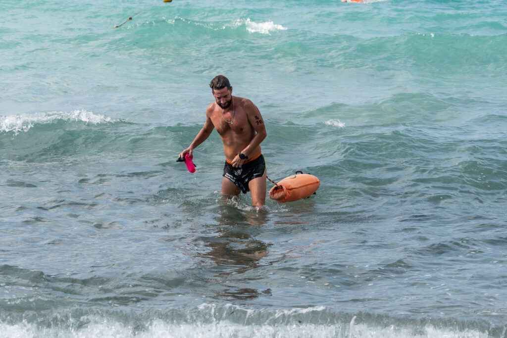 No fue nada fácil, al pasar la boya de Es Vedranell y emprender el regreso, nos metimos en un banco gigantesco de medusas, imposible escapar. Gritos de auxilio, nadadores con picaduras por todas partes, seis en mi caso, agobio generalizado, pánico. En la lancha a la que me subí, una chica inglesa temblaba por la reacción alérgica y sacó de la boya un inhalador, en ese momento parecía claro que abandonaríamos, pero la tía dijo: “quiero terminar la carrera, pero solo que sin medusas”, una auténtica valiente, la terminó, yo también. Luego enorme satisfacción, y comilona en Es Boldado, y al día siguiente al hospital a por una inyección de Urbason.